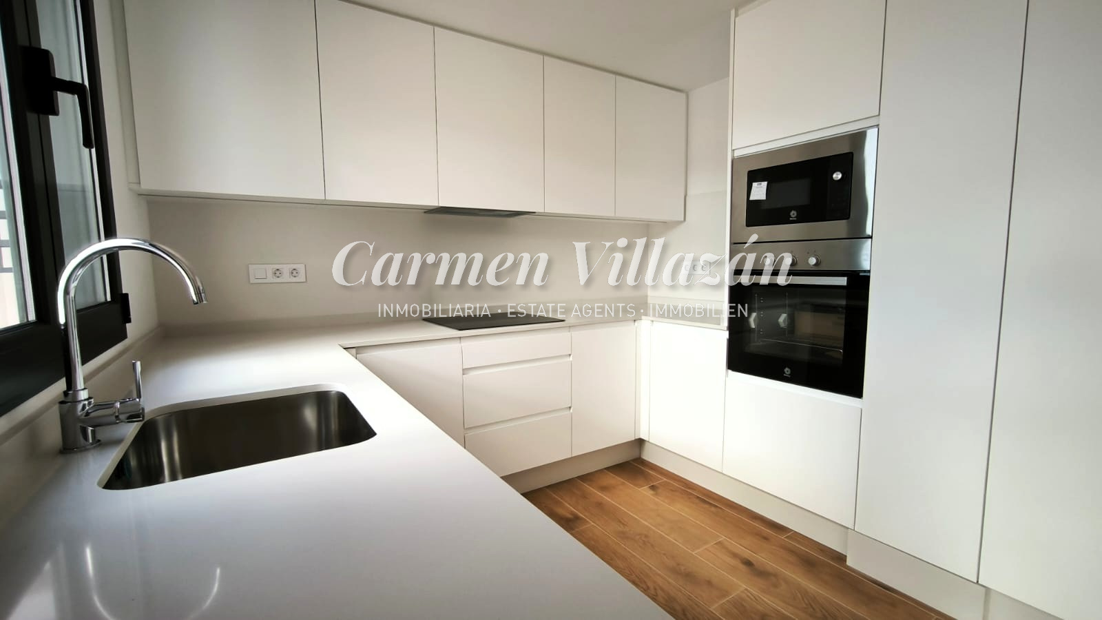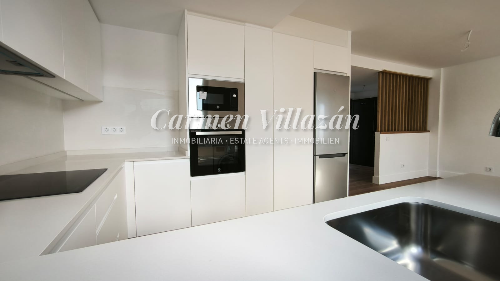 *Möblierte Küche in Weiß, ausgestattet mit Balay-Geräten: Kühlschrank, Backofen, Mikrowelle, Geschirrspüler, Cerankochfeld, Dunstabzugshaube und 8-kg-Waschmaschine.