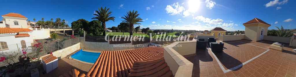 Impressionnante villa individuelle à vendre dans l'urbanisation La Siesta, sur le parcours de golf de Fuerteventura, à Caleta de Fuste. Située à côté de l'Hôtel Elba Palace Golf, cette propriété offre un emplacement privilégié, idéal aussi bien pour les amateurs de golf que pour ceux qui recherchent un environnement paisible avec toutes les commodités d'une station balnéaire à quelques pas.