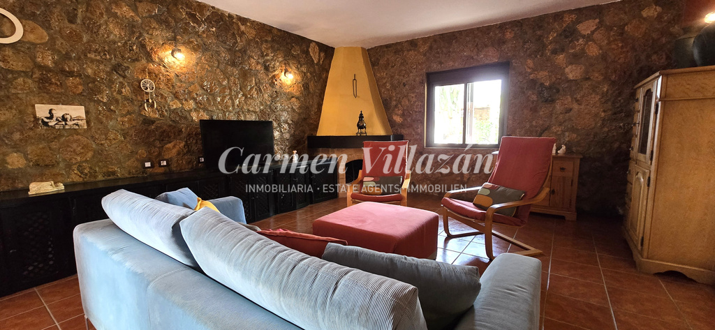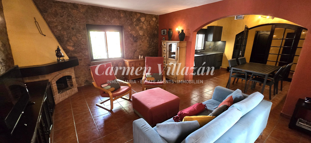 Hay una cocina nueva y moderna que conecta con un amplio salón con chimenea de leña. Desde el salón se accede a una terraza cerrada que, además de comunicar con la zona de la piscina, puede utilizarse como segundo espacio de estar o como zona para invitados.