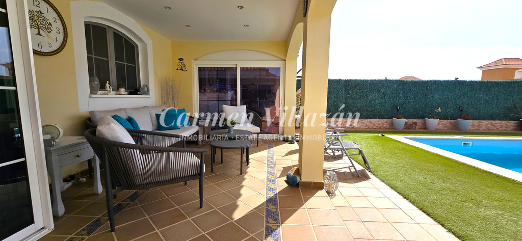 Uno de los grandes atractivos de esta villa son sus excepcionales espacios al aire libre. Desde el salón se accede a una terraza cubierta, ideal para comidas al aire libre o momentos de relax con vistas a la piscina.