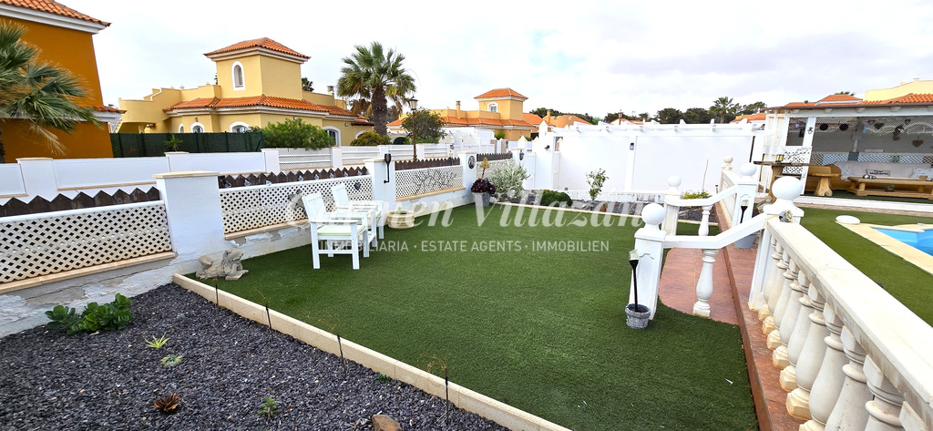 La gran piscina climatizada está rodeada de césped artificial, creando un entorno perfecto para disfrutar del sol y del clima de Fuerteventura durante todo el año. Además, la parcela incluye una zona ajardinada independiente, ideal como área de juegos para niños o como rincón tranquilo para relajarse.