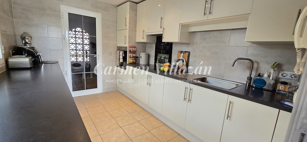 La cocina independiente, de estilo moderno, destaca por su generoso espacio de almacenamiento y superficie de trabajo. Desde ella se accede a un práctico cuarto de utilidad/lavadero con lavadora y espacio adicional de almacenaje.