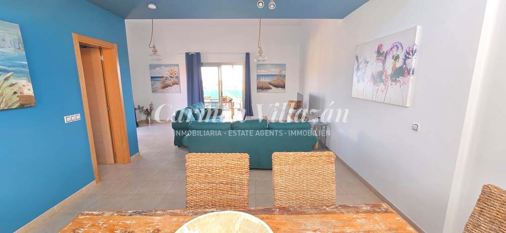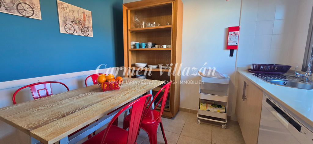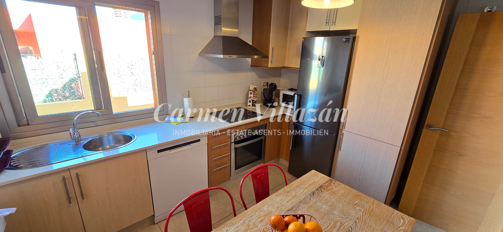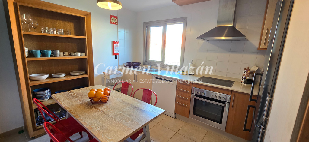 La cocina, independiente y funcional, ofrece espacio suficiente para una mesa de comedor. El salón, luminoso y amplio, ha sido inteligentemente ampliado mediante la integración de un antiguo patio interior, creando un ambiente más acogedor y familiar. Dos puertas correderas conectan directamente con las terrazas y las zonas exteriores, aportando una agradable sensación de continuidad entre interior y exterior.